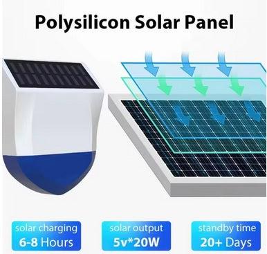 Safety Siren Alarm for home exterior, Remote control, Solar/USB/Battery powered, Bluetooth/Wifi connectivity